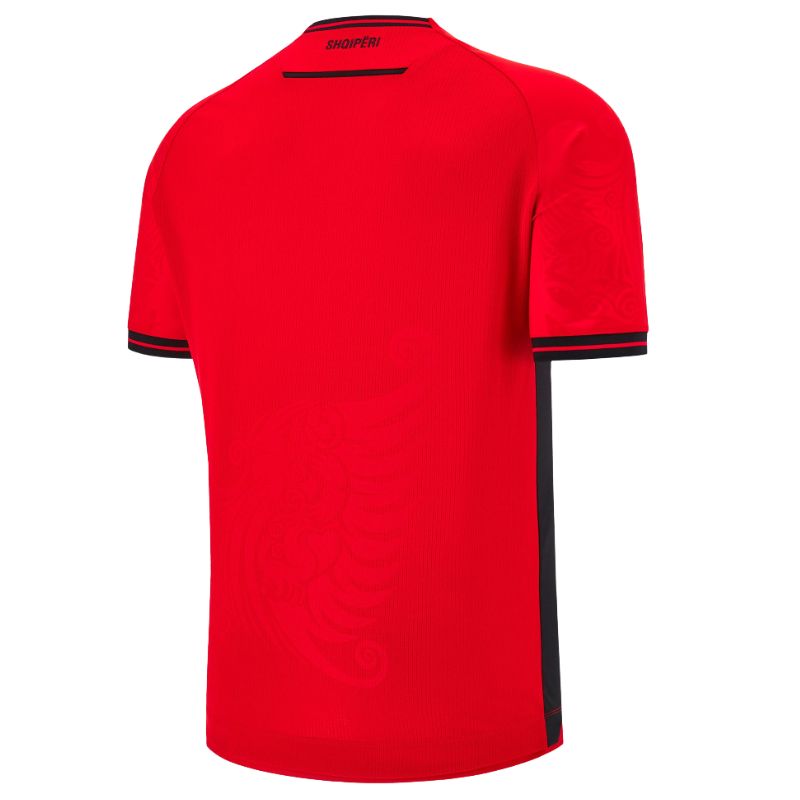 Affichez votre fierté avec le maillot domicile Albanie 2025-2026, en rouge vibrant orné d’un motif aigle bicéphale embossé, symbole national. Avec col noir et inscriptions patriotiques comme « Ti Shqipëri, më jep nder », il allie style et confort. Disponible sur kickoff-store.com