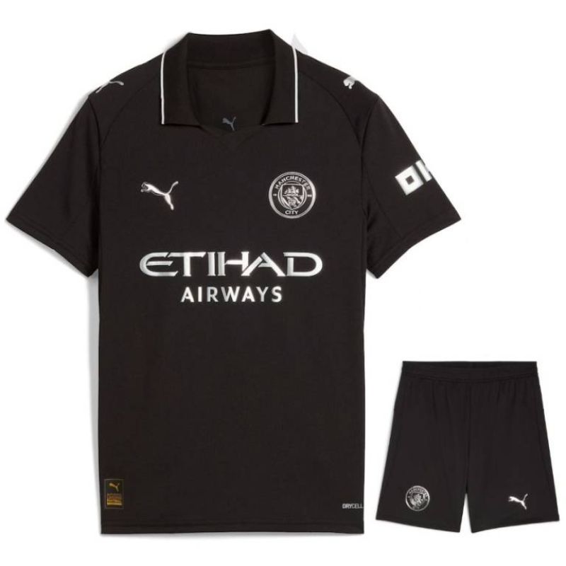 Initiez les jeunes supporters avec le kit enfant extérieur Manchester City 2025-26 ! Ce maillot Puma noir avec détails métalliques, accompagné d’un short assorti, célèbre l’héritage du club. Idéal pour encourager les Sky Blues avec style. Disponible en tailles enfant sur Kick Off Store.