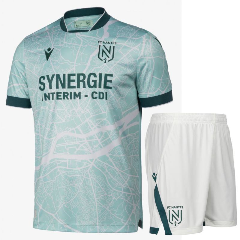 Initiez les jeunes fans avec le kit enfant extérieur FC Nantes 2025-26 ! Conçu par Macron, ce maillot bleu marine audacieux présente un motif sublimé de carte de la ville et l’inscription “Naoned” embossée au dos, accompagné d’un short bleu assorti, célébrant les racines bretonnes et la connexion aquatique de Nantes. Idéal pour encourager les Canaris avec style. Disponible en tailles enfant sur Kick Off Store.