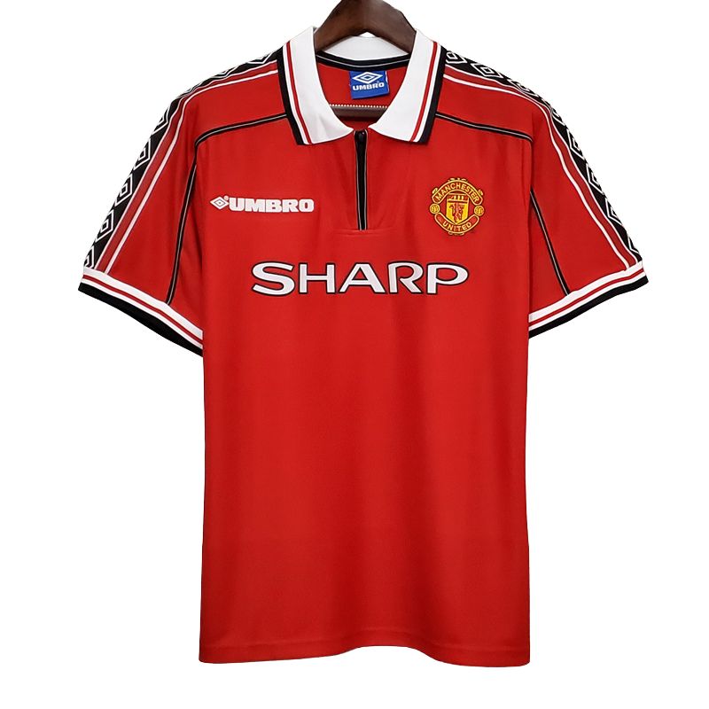 Revivez l’épopée de 1998/1999 avec le maillot domicile Manchester United par Umbro, arborant le sponsor SHARP. Ce design rouge iconique, symbole du triplé historique, offre confort et style rétro. Une pièce culte pour les fans, disponible dès maintenant sur kickoff-store.com !