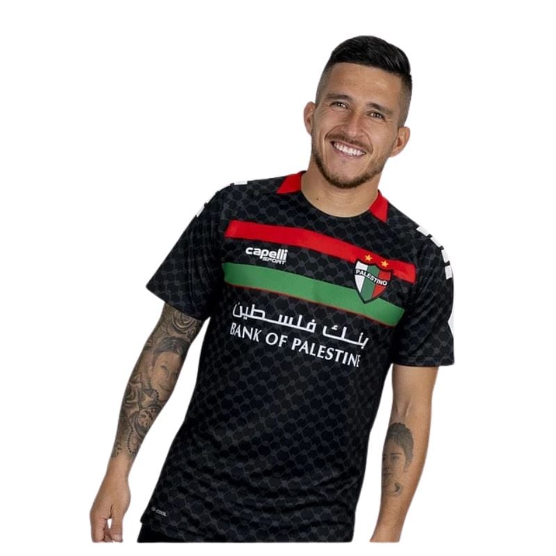 Soutenez les Lions de Canaan avec le maillot extérieur Palestine 2025-2026 par Kelme. En noir audacieux avec des accents rouges, verts et blancs, il arbore un motif keffieh subtil, symbole de résilience. Conçu avec des matériaux respirants pour un confort optimal, il est idéal pour les fans. Disponible sur kickoff-store.com