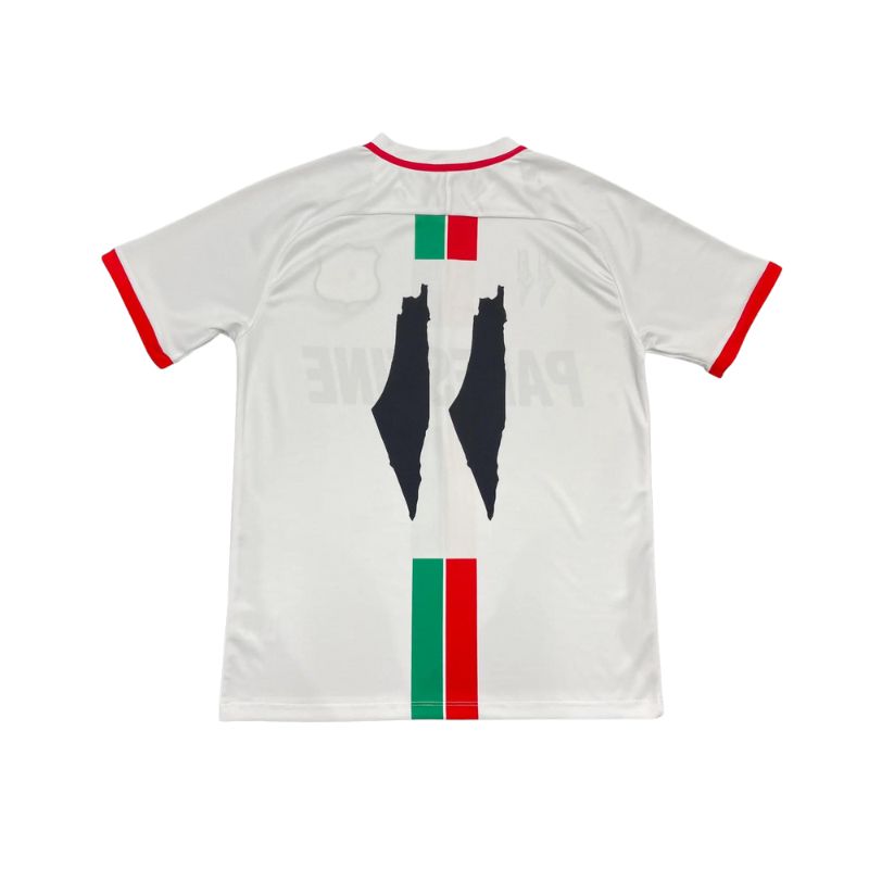 Maillot de football homme ajusté aux couleurs traditionnelles du drapeau palestinien. Cette édition présente la Palestine en anglais et tous les maillots sont également imprimés avec le numéro 11 dans le dos, en forme de carte de la Palestine.